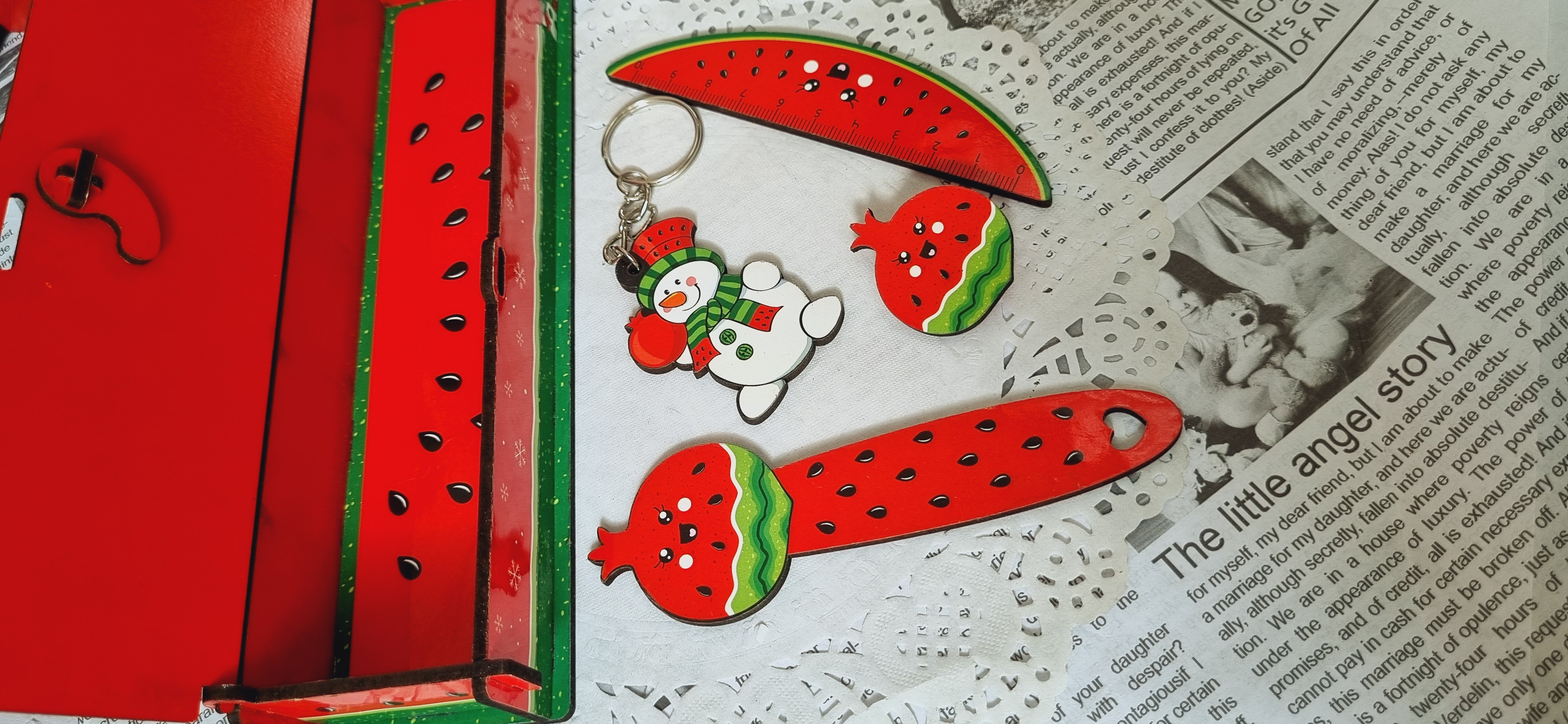 متعلقات داخل جامدادی: خط کش، بوک مارک، جاکلیدی و پیکسل