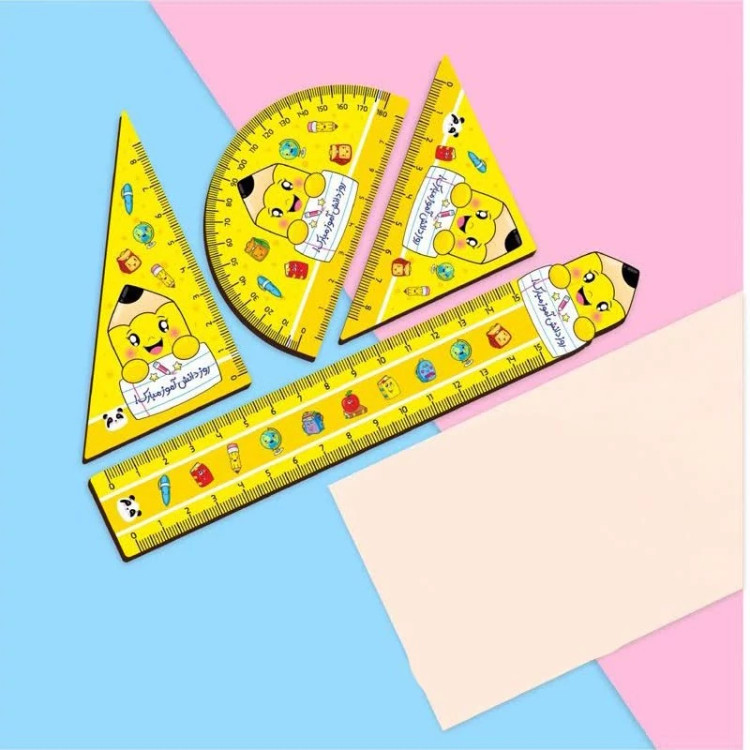 یه محصول و گیفت کاربردی و خوش قیمت برای خوشحالی بچه ها توی روز دانش آموز این محصول شامل: خط کش، نقاله، گونیا 45 درجه و گونیا 60